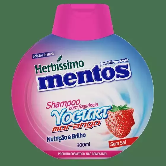 Shampoo para todos os tipos de cabelos. Herbíssimo Mentos Yogurt Morango proporciona uma limpeza saudável e nutrição aos fios.